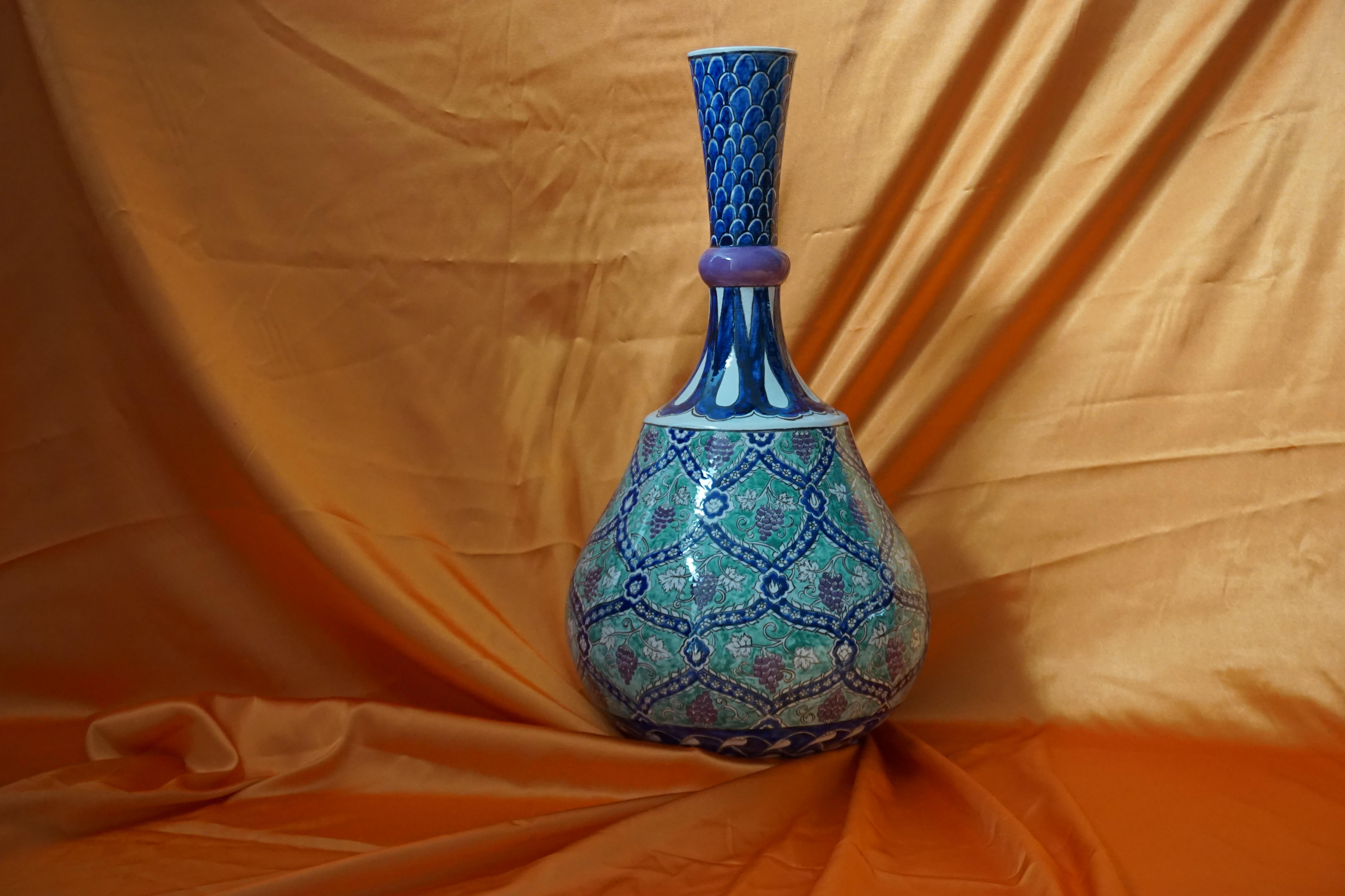 Osmanlı sanatının zarif çizgilerini modern bir dokunuşla buluşturan bu el yapımı çini vazo, evinize şıklık ve tarih kokan bir atmosfer kazandırır. Gövdesindeki rumi ve bitkisel motifler, geleneksel desenlerin zarafetini mavi ve turkuaz tonlarıyla yansıtır.